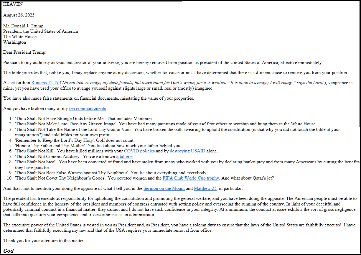 A letter from God to Trump based on Trump's letter to Dr. Lisa D. Cook.
